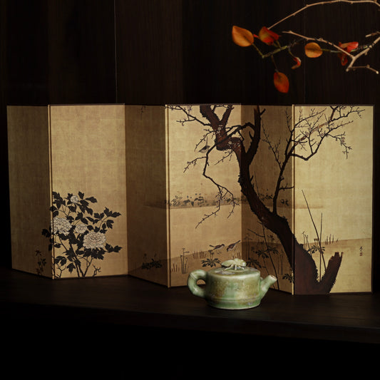 Dual-Sided Japanese Snow Scene Folding Screen – Cypress & Pine Winter Tablescape